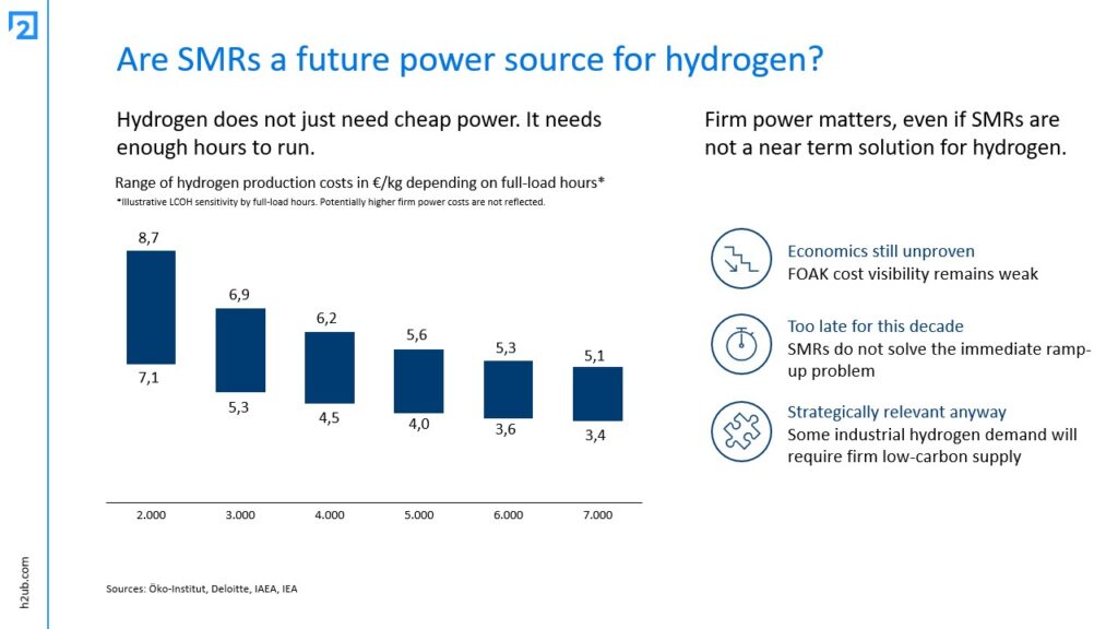 In theory, SMRs could provide firm low carbon electricity for electrolysis and, depending on the setup, usable heat for high-temperature pathways. That matters because higher electrolyzer utilisation and better overall system efficiency are two strong levers for lowering LCOH, especially in industrial use cases where continuous output matters more than occasional cheap production peaks.